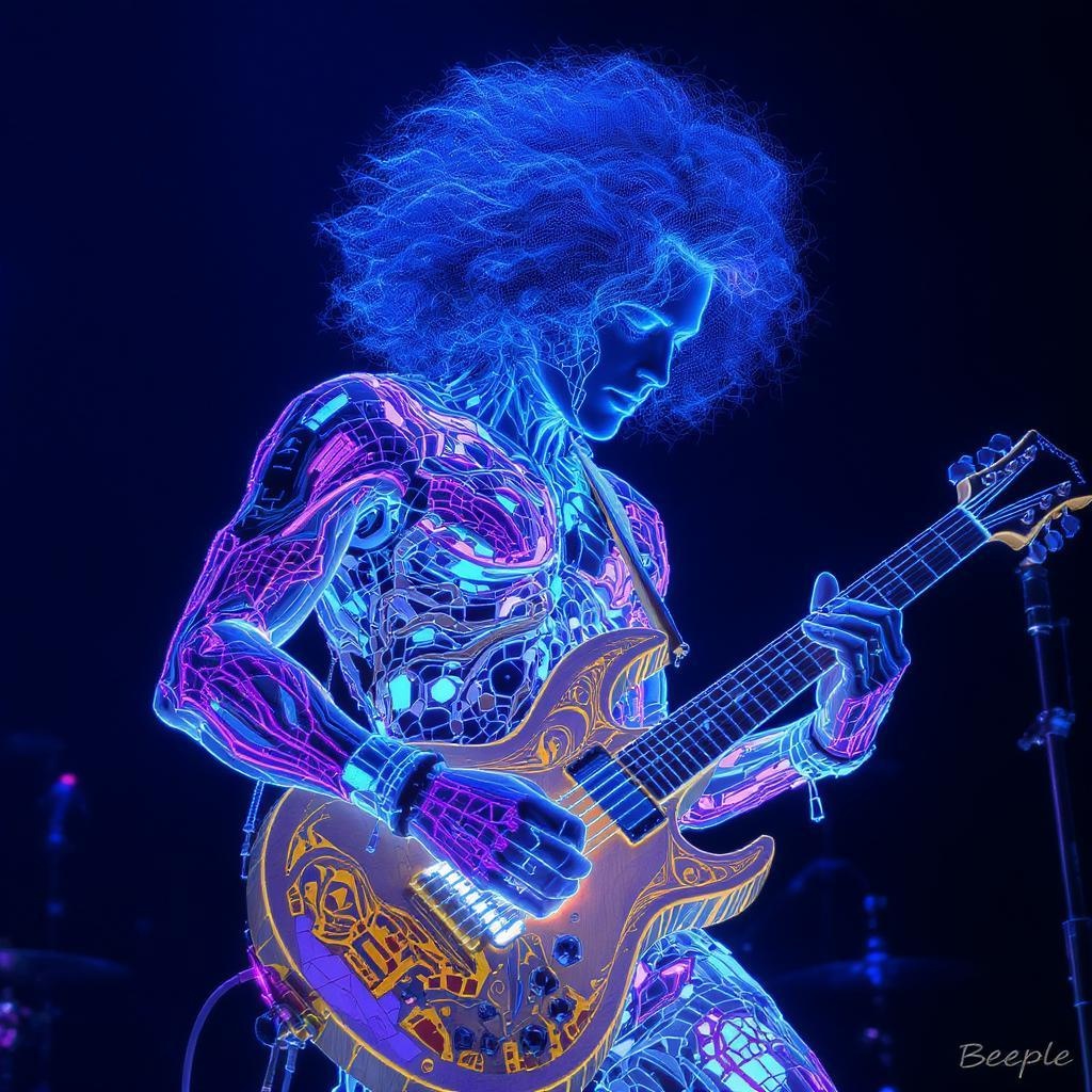 A hyper-realistic depiction of a curly-haired musician, infused with the style of Beeple, emanating a vibrant, true blue luminescence. The figure pulses with intricate, sculptural patterns that intertwine with bright gray and electric purple hues. These colors weave through an elaborate network of delicate layers that form an organic, flowing structure. The composition is rich in hyper-detail, showcasing a mesmerizing blend of cybernetic and organic elements, as the musician appears to be in a dynamic state of motion, capturing the essence of creativity and rhythm.