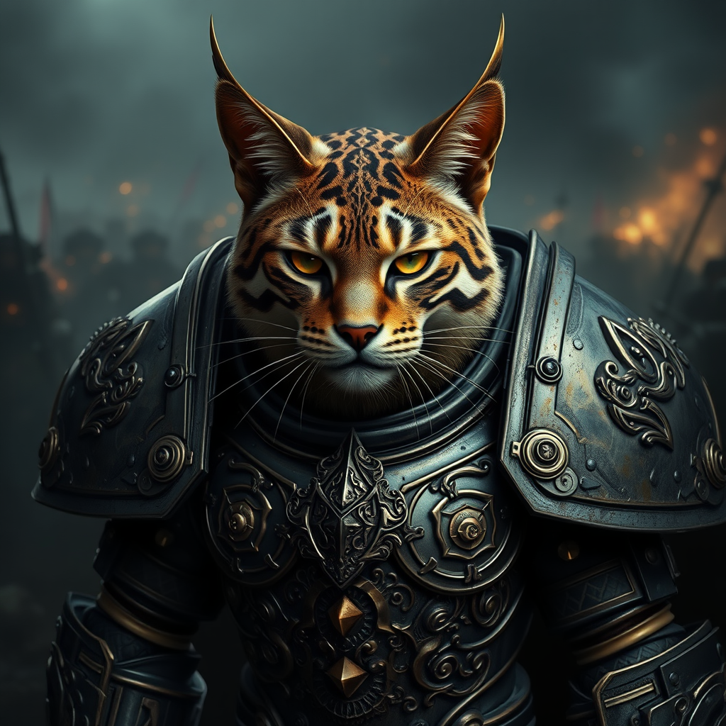 A hyper-realistic depiction of a feline in ornate power armor reminiscent of adeptus astartes, featuring intricate detailing on the armor plates. Set in the grim Warhammer 40k universe with dark tones and cinematic lighting, the scene captures an imposing and noble presence. The armor shines with a subtle patina, and the eyes of the cat glow with an enigmatic intensity. The background is a chaotic battlefield, adding a dynamic contrast to the stoic figure in the foreground.