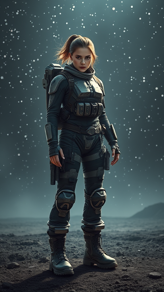 A hyper-realistic depiction of a female X-wing pilot standing poised in a futuristic space suit, complete with rugged boots. The design exudes an epic fantasy vibe, incorporating warcore elements with graphic details. Her appearance is marked by harsh, determined features, framed in cinematic lighting that casts dramatic shadows. The scene has a grainy texture, emphasizing the grit and resilience of the character. Set against a vast, star-filled backdrop, the composition captures her readiness for adventure in the vastness of space, rendered in stunning 8k detail with a 16:9 aspect ratio.