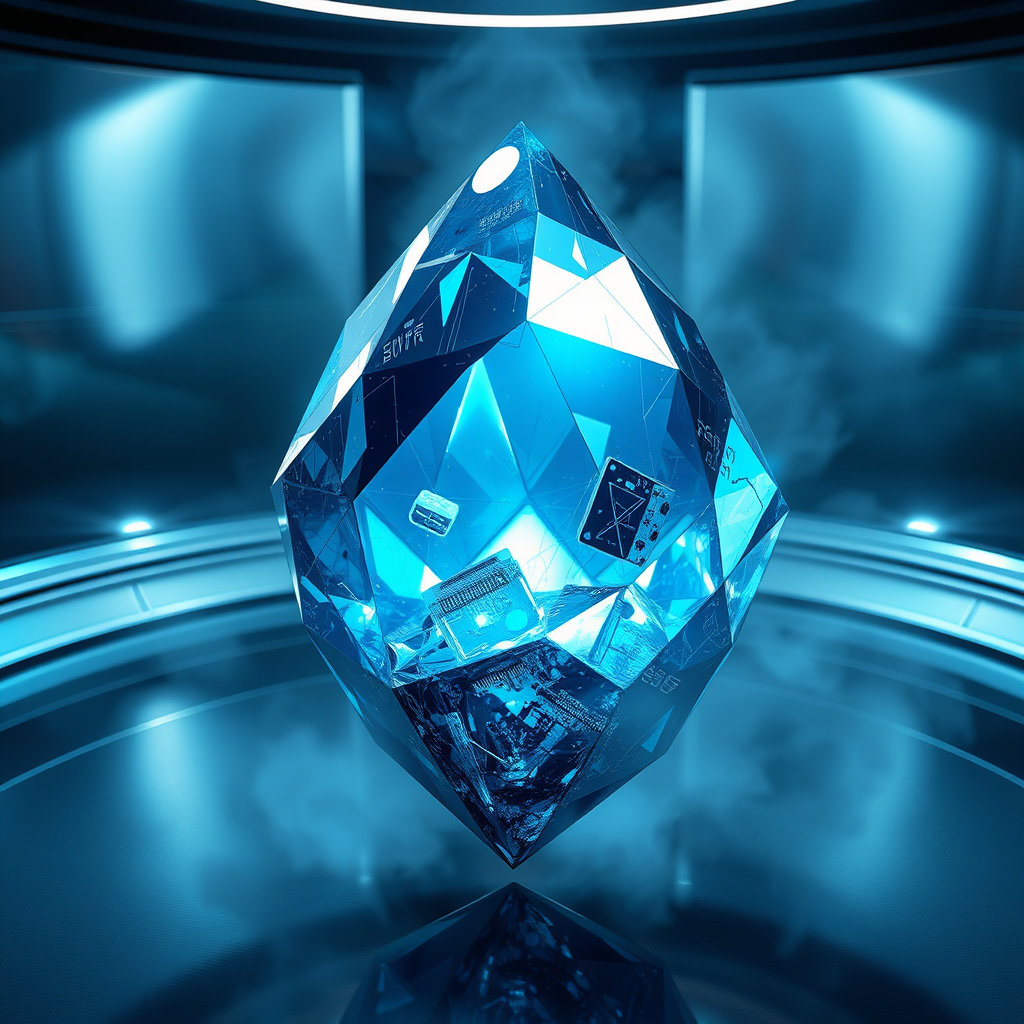 A hyper-realistic depiction of a futuristic crystal, glowing with an ethereal blue and silver luminescence, its facets reflecting intricate patterns of light. The crystal hovers in an ultra-modern environment, casting abstract shadows against sleek metallic surfaces and surrounded by a faint mist that gives it an otherworldly aura. Subtle hints of embedded circuitry within the crystal hint at its advanced technological origin.