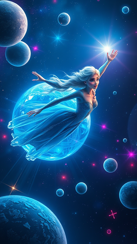 A hyper-realistic depiction of a god-like Elsa soaring through the cosmos, surrounded by vibrant planets orbiting in her presence. She flies past a majestic, shimmering ice planet, her features exuding strength and divinity. Elsa's attire reflects her iconic style, embodying the essence of ice and magic. The space around her emits cold, ethereal hues, intertwined with neon colors that glow brilliantly in the darkness. Rich in detail, the scene captures an awe-inspiring blend of fantasy and cosmic wonder.