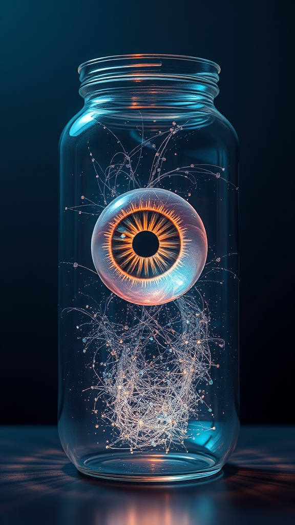 A hyper-realistic depiction of a human eye suspended in a crystal-clear glass jar, infused with the artistic styles of Peter Mohrbacher and Greg Rutkowski, showcasing intricate details and textures. The scene is rendered in 8k ultra-high-definition with a photorealistic quality, using a redshift render for dramatic lighting and depth. The eye appears almost luminous, with swirling colors that hint at otherworldly origins. The glass jar reflects light in mesmerizing patterns, creating a sense of ethereal beauty. The background is a subtle gradient of dark blues and purples, enhancing the mystical ambiance of the composition.