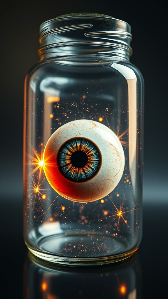 A hyper-realistic depiction of a human eye suspended in a crystal-clear glass jar, rendered with intricate details and capturing the essence of works by Peter Mohrbacher and Greg Rutkowski. The image showcases an unparalleled level of detail in 8k UHD resolution, rendered with redshift for a stunning photorealistic effect. The eye, vivid and mesmerizing, floats gracefully, surrounded by subtle, ethereal glimmers hinting at an otherworldly presence. The composition embraces a 16:9 aspect ratio, immersing the viewer in a captivating dance of light, color, and shadow within the jar.