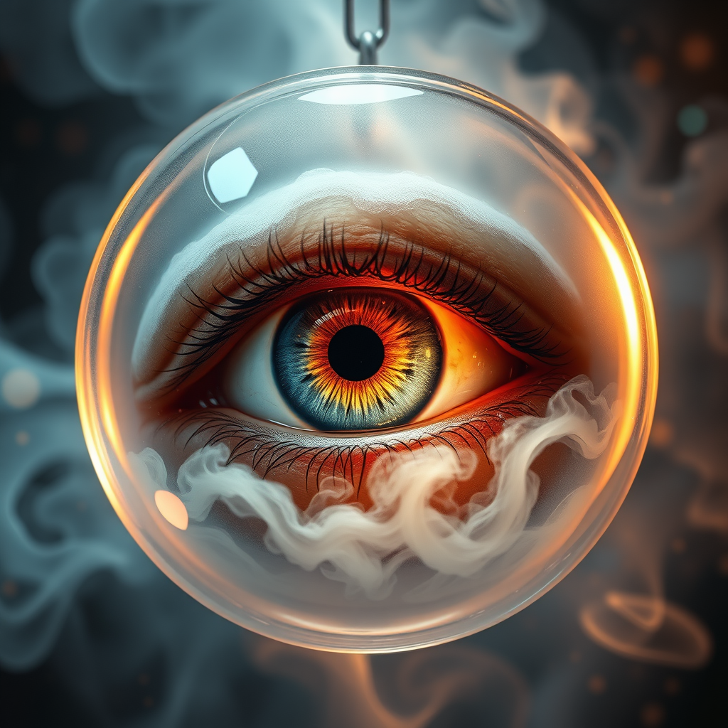 A hyper-realistic depiction of a human eye suspended in a crystalline jar, surrounded by swirling mist, with intricate details capturing the delicate iris and lifelike textures, illuminated with a soft, ethereal glow, rendered using advanced lighting techniques, capturing every minute detail in 8k ultra high definition, inspired by the styles of Peter Mohrbacher and Greg Rutkowski, accentuated by a surreal background of shifting colors and patterns, emphasizing the mysterious and otherworldly essence of the scene.