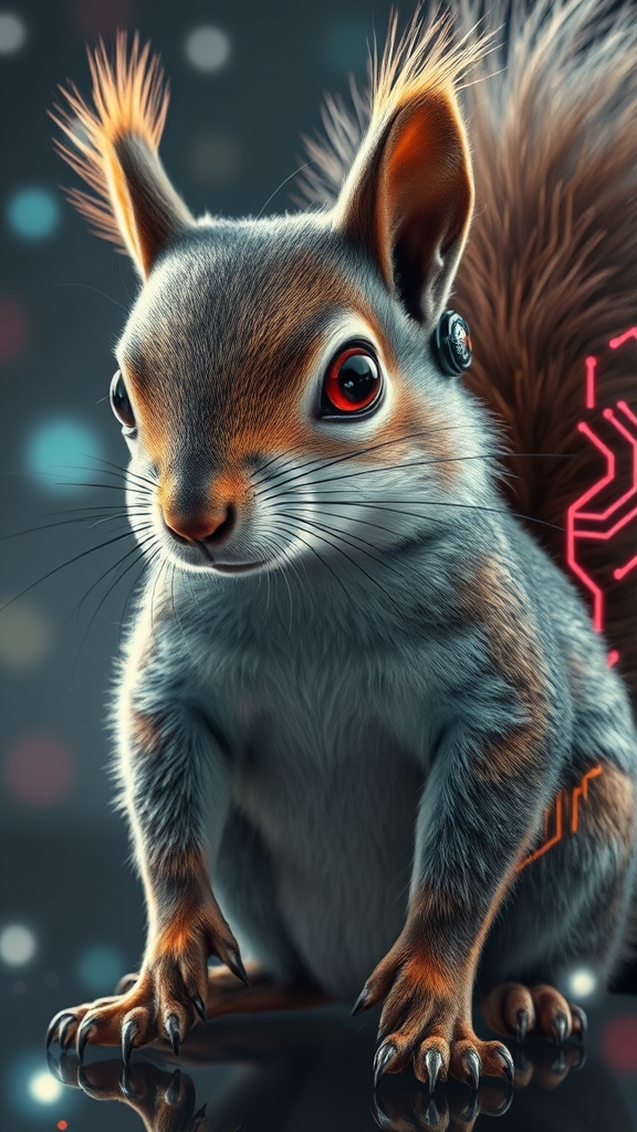 A hyper-realistic depiction of a human-like squirrel with dramatically oversized features, featuring cyberpunk-inspired glowing eyes and intricate cybernetic enhancements. This visual masterpiece highlights high-definition details, showcasing fine, intricate elements. The squirrel appears in an 8K resolution, immersed in a holographic aura, where three-dimensional images are created through intersecting beams of light, adding depth and a futuristic twist to the concept. Subtle creative adaptations include a metallic sheen on fur and a vibrant neon circuit pattern on its tails, accentuating the seamless blend of organic and technological.