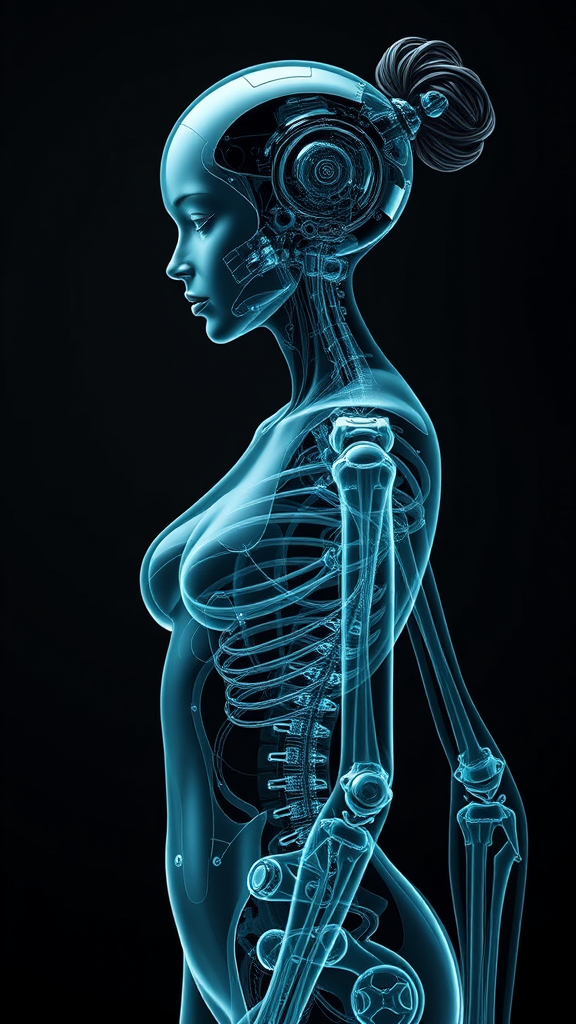 A hyper-realistic depiction of a humanlike android featuring a feminine form, rendered in the style of x-ray film with a dark cyan and black palette. The android exudes youthful energy, with graceful, sculpture-like qualities. Attention is meticulously given to its joints and connections, highlighting the intricate mechanics beneath. The overall aesthetic possesses an avant-garde allure, blending technology with humanity in harmonious elegance.