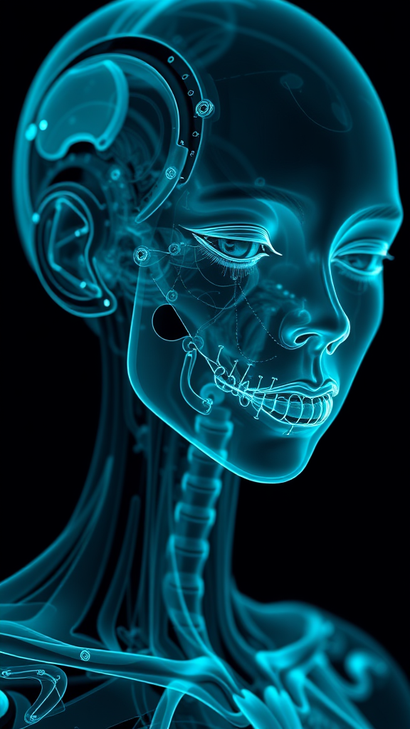 A hyper-realistic depiction of a humanlike android, featuring the face and feminine form rendered in the style of an x-ray film. The color palette consists of dark cyan and black, with a focus on graceful sculptures and youthful energy. Emphasis is placed on the intricate details of joints and connections, highlighting the seamless integration of mechanical and organic elements. The composition captures a sense of fluidity and elegance, blending the raw essence of life with advanced technology.