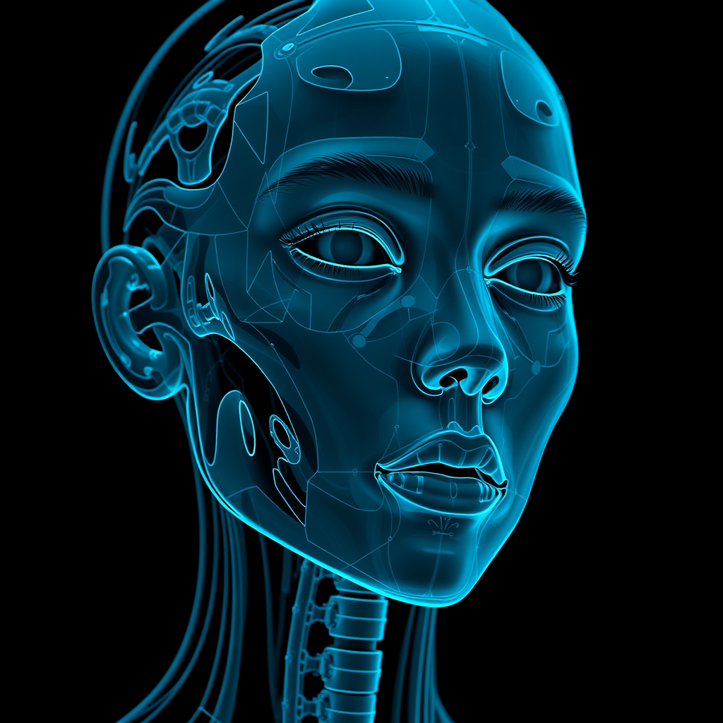 A hyper-realistic depiction of a humanlike android's face, rendered in the style of x-ray film, showcasing a feminine form with a dark cyan and black palette. The composition features elegant sculptures, exuding youthful vitality and capturing intricate details of joints and connections.