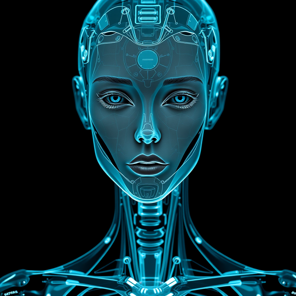 A hyper-realistic depiction of a humanlike android's face, styled like x-ray film, featuring a feminine body rendered in dark cyan and black. The design emphasizes graceful, sculptural forms and exudes youthful energy. Attention is placed on the intricate details of the joints and connections, showcasing the elegance of its construction. The overall portrayal captures both the sophistication and vibrancy of advanced technology, presented in an unprocessed and raw style.