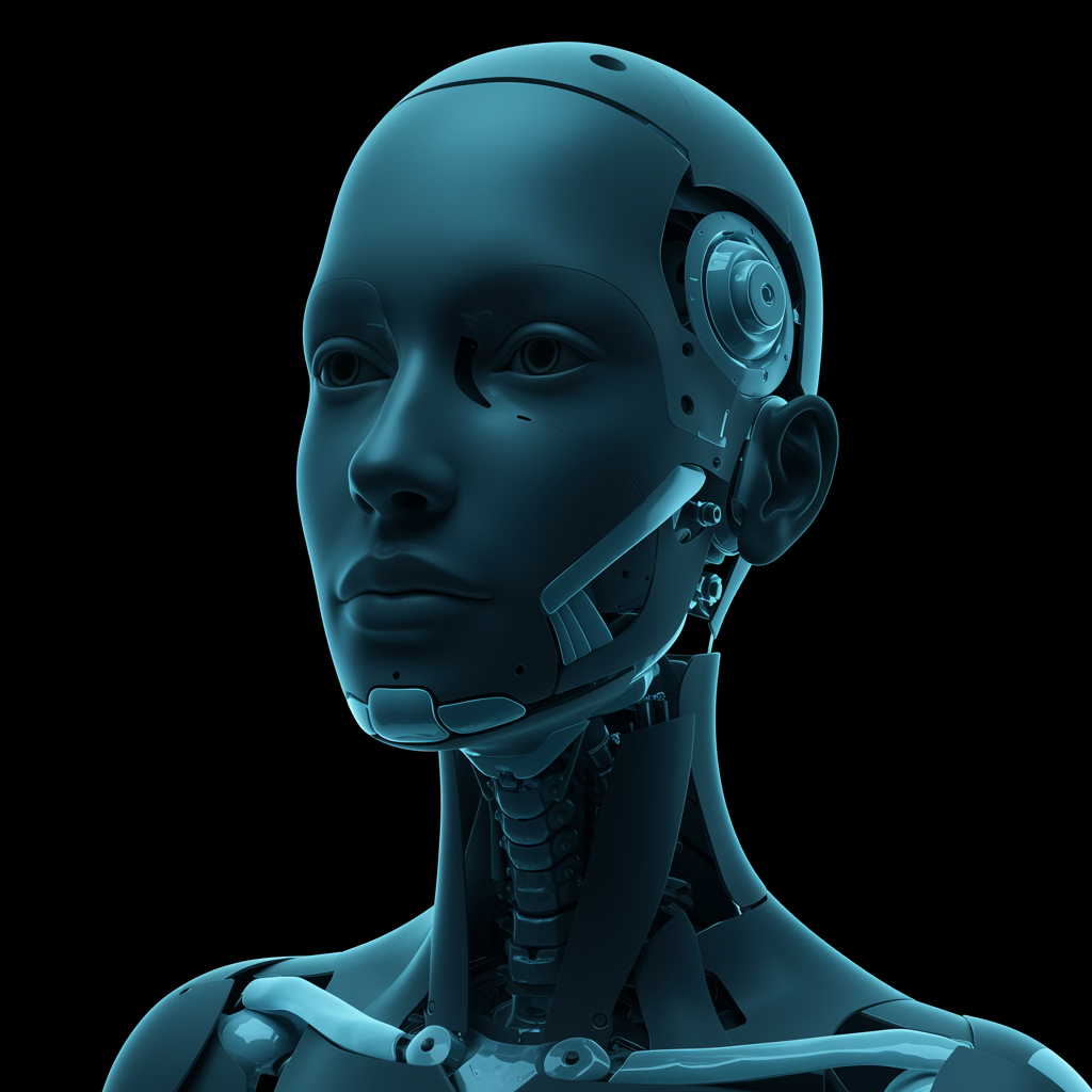 A hyper-realistic depiction of a humanlike android's face, resembling x-ray film, featuring a feminine form in dark cyan and black hues. The scene emphasizes the elegant structure of graceful sculptures, capturing youthful vitality. The focus sharpens on the intricate details of joints and connections, showcasing a seamless blend of technology and humanity. The composition maintains a raw and vivid aesthetic, evoking a sense of awe and wonder.