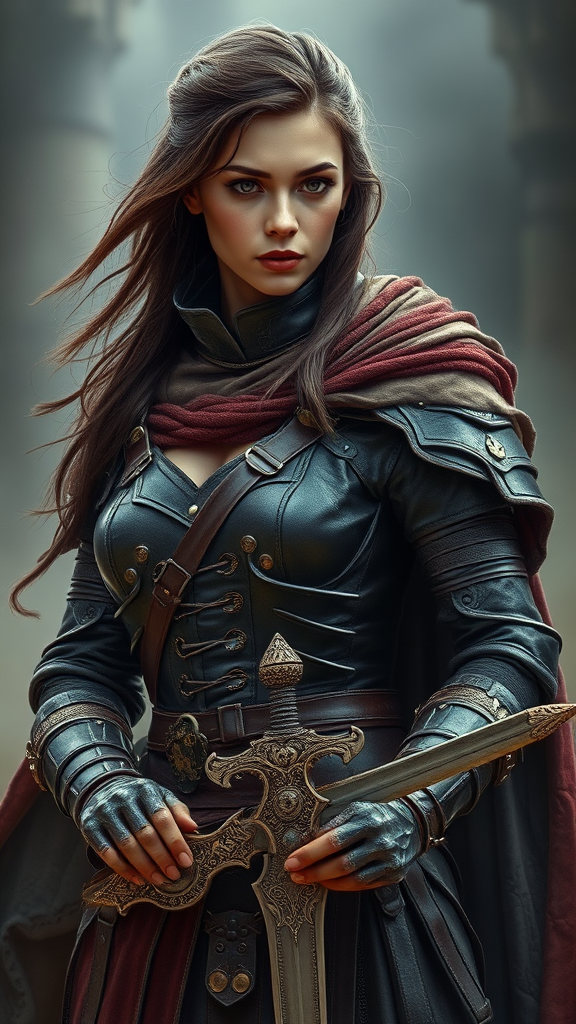 A hyper-realistic depiction of a medieval warrior woman clad in leather armor intricately detailed with metallic accents, her tattered cloak billowing behind her. Straps and embellishments adorn her outfit, accentuating her imposing presence. She grips a long ornate sword, its hilt intricately decorated. The background is shrouded in a misty glow, evoking a sense of mystique and grandeur. Her expression is one of deep concentration, exuding mystery and a readiness to face any challenge before her.