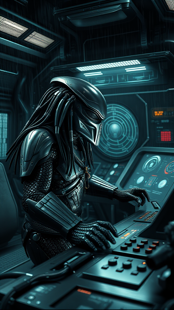 A hyper-realistic depiction of a Predator from the movie "Alien vs Predator" as a futuristic hologram at a sophisticated control panel within a dark spaceship. The scene is intricately detailed, with hidden elements and a high dynamic range that accentuates the wet, shadowy environment. Attention to detail is paramount, with textures appearing almost tangible, from the glistening armor to the complex alien technology. The atmosphere is dark and foreboding, with subtle lighting illuminating the Predator's fearsome features. The rendering is devoid of any artist signatures, watermarks, or distracting text, ensuring a focus on the immersive quality and lifelike representation without any visual imperfections such as blurriness or digital artifacts.