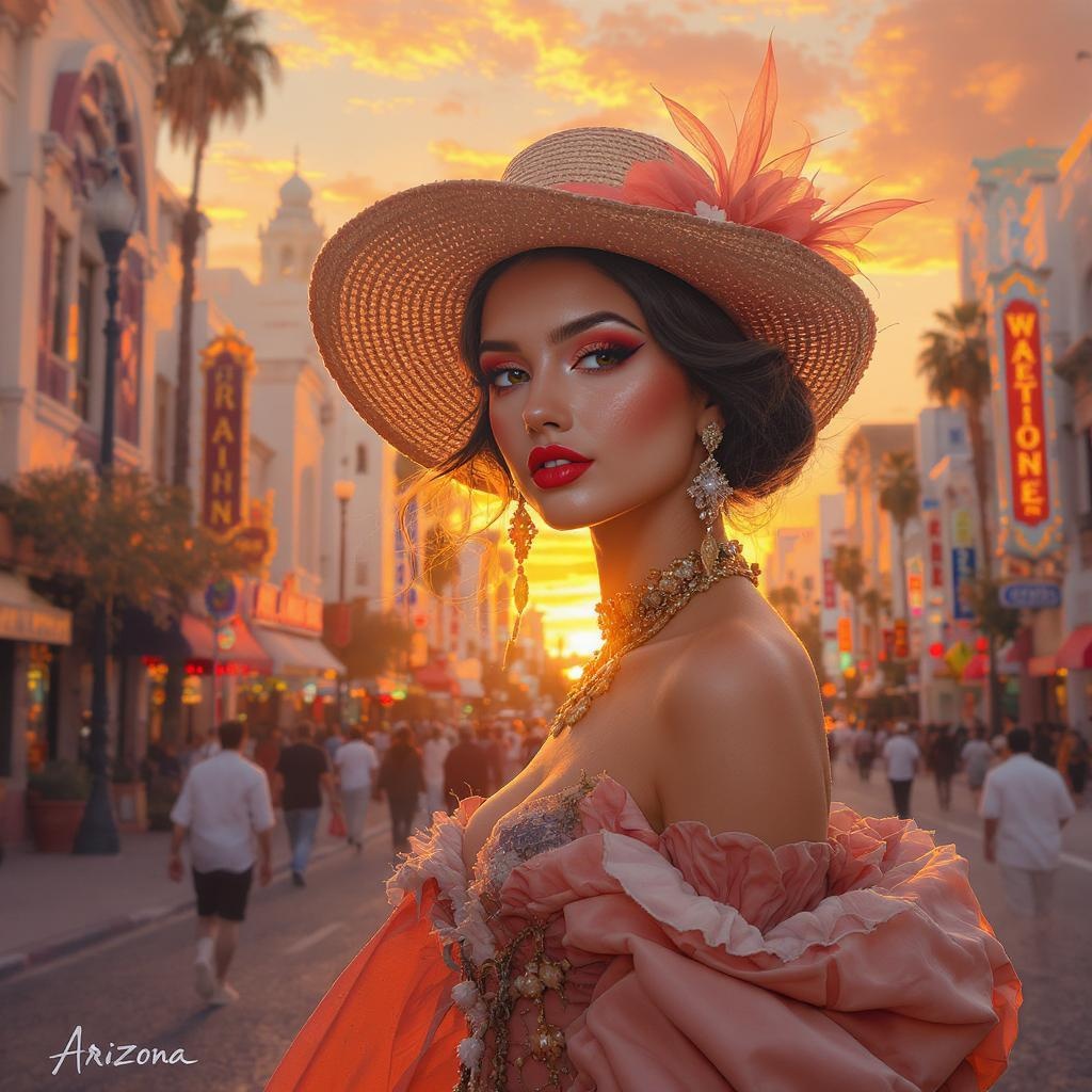 A hyper-realistic depiction of a stunning girl on a bustling city street in Arizona, inspired by JC Leyendecker and the Art Nouveau style, capturing intricate details with an octane render in 3D, set against a vivid desert sunset that enhances the scene's depth and vibrancy --ar 9:16 --uplight.