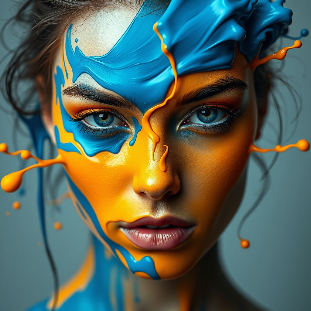 A hyper-realistic depiction of a woman with blue and orange paint intricately cascading across her face, rendered in the style of vray tracing. The design features fluid forms and dynamic color splashes, incorporating deep cyan and vibrant yellow to create a polished metamorphosis effect. The scene is rich with photorealistic techniques, emphasizing meticulous details and vibrant contrasts, resulting in a striking visual transformation.
