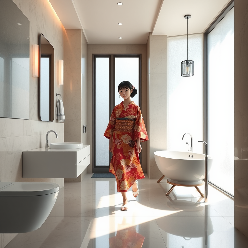 A hyper-realistic depiction of a young Japanese girl casually strolling through an elegantly designed bathroom, with soft natural light filtering through frosted glass windows, casting gentle patterns on the sleek, polished tiles; her traditional kimono subtly contrasted by the modern fixtures around her, creating a harmonious blend of tradition and contemporary style.
