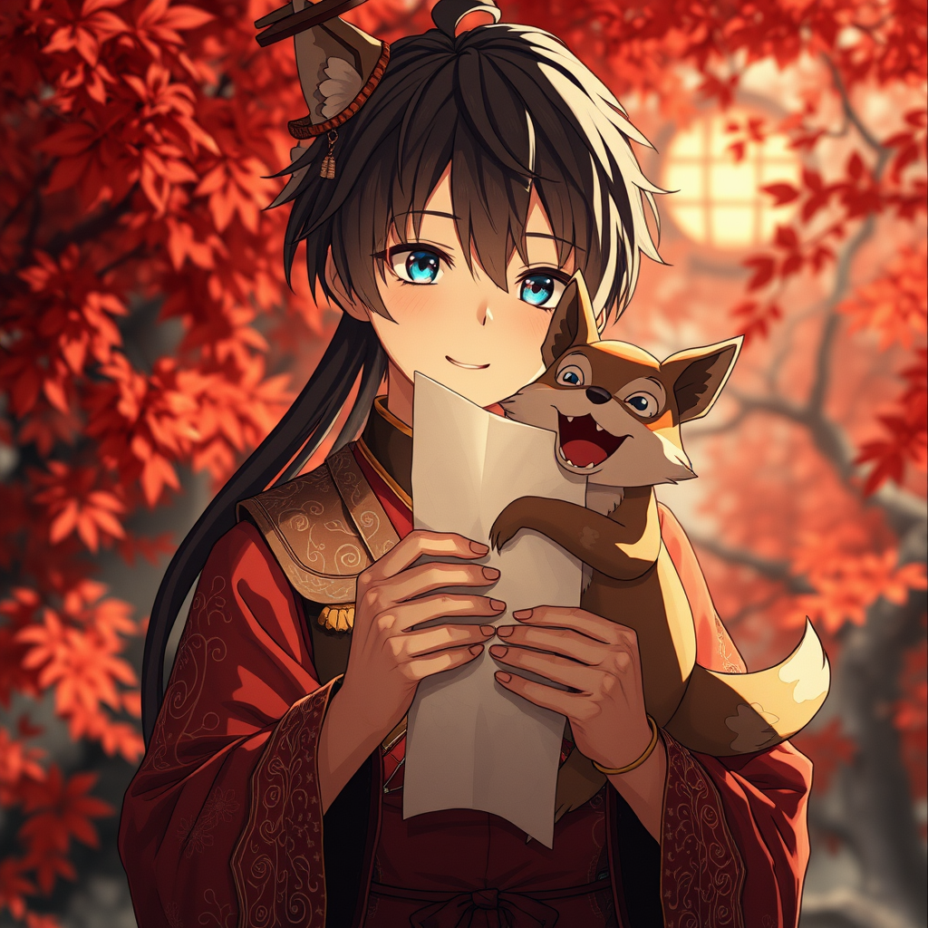 A hyper-realistic depiction of an anime character clutching a piece of paper that morphs into a lively animal, set against a backdrop of lush, red and brown hues. The character is adorned in intricately detailed costumes that echo Max Rive's styling, blending the dynamic and imaginative essence of TarΕ Okamoto. The ambiance is captured with the cinematic clarity of Cinestill 50D film, emphasizing realist detail reminiscent of Luke Fildes' works. The scene unfolds with a raw, vibrant energy, illuminating the character's expression and the mystical transformation of the paper into an animal companion.