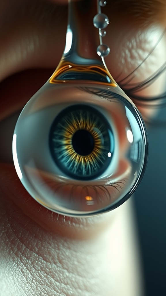 A hyper-realistic depiction of an eye encapsulated within a glistening water drop, reminiscent of CryEngine's vivid detail. Inspired by the hauntingly beautiful narratives of Pegi Nicol MacLeod, this scene captures an ethereal and evocative atmosphere. The setting is enriched by Thomas Saliot's influence, presenting an ultra-realistic, close-up view that narrates a captivating story. The image is framed in a 9:16 aspect ratio, with a touch of stylized artistic flair that adds a compelling depth to the hyper-detailed and immersive composition.