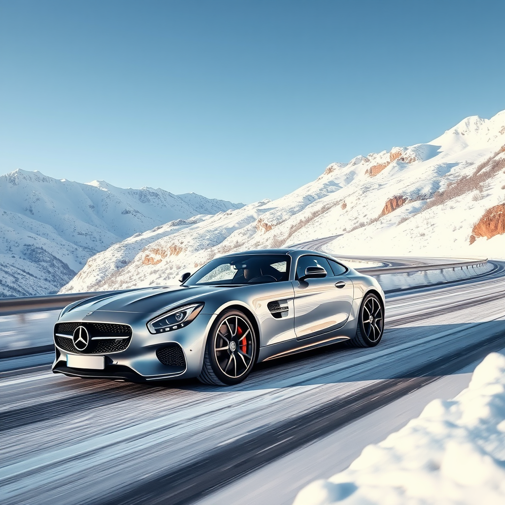 A hyper-realistic depiction of an opulent silver Mercedes sports car gliding smoothly along a snowy mountain highway, glistening under a clear, crisp winter sky, with the vehicle's sleek silhouette contrasting sharply against the pristine white landscape.