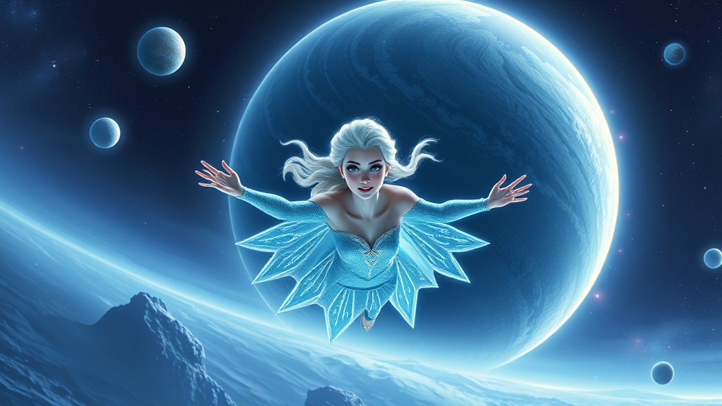 A hyper-realistic depiction of Elsa as a celestial deity soaring through the cosmos, surrounded by swirling planets, adorned in her iconic attire. She floats majestically in front of an enormous, mystical ice planet, her features exuding divine strength and grace. The scene is enveloped in a frosty cosmic palette with neon luminescent hues that glow against the dark expanse, showcasing intricate, high-definition details for a breathtaking cosmic tableau.