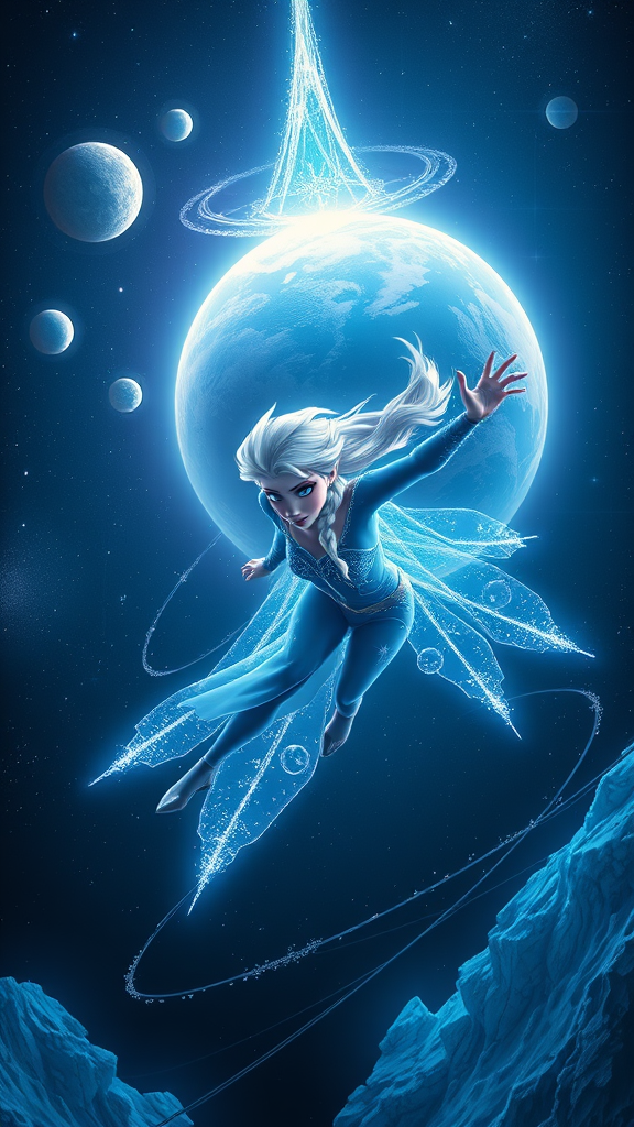 A hyper-realistic depiction of Elsa as a divine figure soaring through the cosmos, celestial bodies orbiting around her presence, gliding before an immense enchanted ice-covered planet. Her features are powerful and god-like, adorned in Elsa’s iconic attire, set against a backdrop of cold space hues with neon luminescence illuminating the dark void. The scene is rendered with intricate detail and vibrant colors, capturing a sense of ethereal majesty and cosmic wonder.