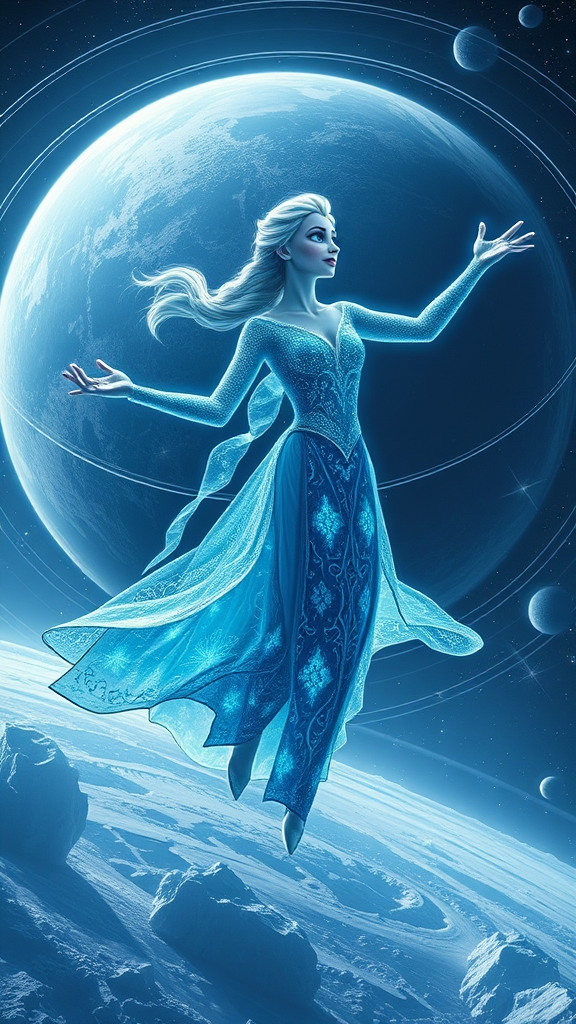 A hyper-realistic depiction of Elsa embodying god-like majesty, soaring through the vastness of space, surrounded by a celestial dance of planets orbiting her form. She glides effortlessly before an enormous, enchanting ice planet, her presence commanding and divine. Elsa's attire reflects her regal nature, shimmering with cold hues of the cosmos, etched with intricate patterns that glow in the dark. Her features are strong and ethereal, illuminated with an enchanting neon luminescence. The scene is rendered with an extraordinary level of detail, capturing the serene yet powerful essence of a celestial deity.