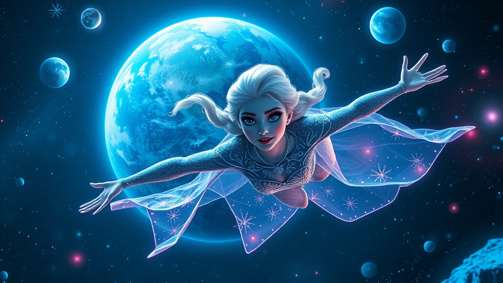 A hyper realistic depiction of Elsa portrayed as a celestial deity soaring through the cosmos, surrounded by luminous planets. She glides gracefully before a colossal, enchanted ice planet, her features striking and divine. Elsa is adorned in her iconic attire, enhanced with intricate designs that shimmer in the frigid glow of space. The scene is imbued with cold cosmic hues and vibrant neon colors that radiate in the dark, accentuating the high level of detail and otherworldly ambiance.