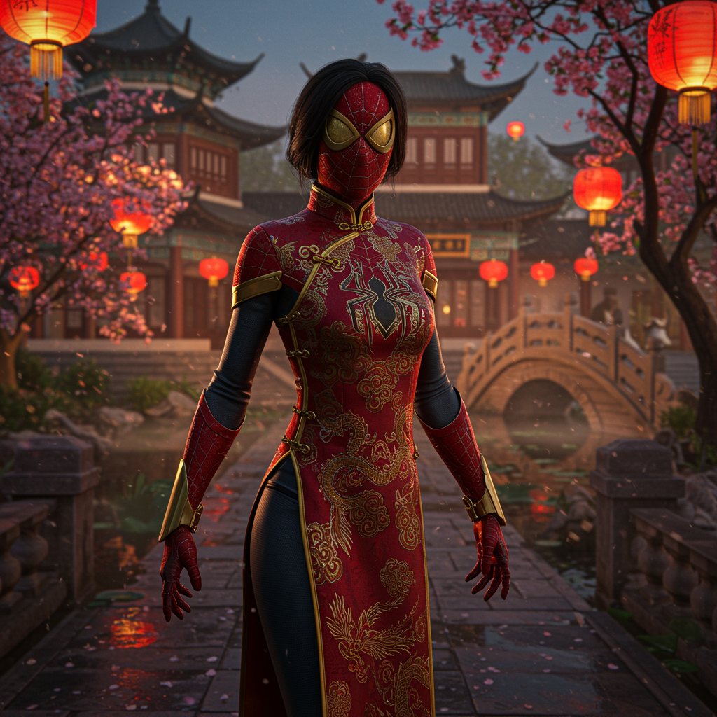 A hyper-realistic depiction of Spider-Woman features a full-body view in photorealistic 8K rendering, adorned with a sophisticated costume that combines the elegance of a traditional Chinese qipao with modern superhero flair. Her suit boasts a deep crimson base embellished with intricate gold embroidery showcasing dragons and phoenixes intertwined with subtle spider-web motifs. The design includes a high-collared neckline and side slits, reminiscent of a classic qipao silhouette, complemented by futuristic elements like armored sleeves and sleek gloves. Her mask, a matching deep red, glows with mysterious golden eyes. A silk cape, decorated with delicate gold lotus flower motifs, flows behind her, adding a touch of grace and dynamic movement. Set in a traditional Chinese courtyard at dusk, the scene is bathed in the warm glow of ancient red lanterns amidst pagoda-style structures. The ambiance is enhanced by blooming cherry blossom trees and a serene stone bridge arching over a tranquil pond. The ground, glistening from a recent rain, reflects the soft lantern light, while a delicate mist weaves through the air. Her pose captures a blend of dynamism and elegance, embodying strength and poise. The scene is rendered with hyper-detailed textures, lifelike proportions, and cinematic lighting that celebrate the elegance and mystique of Chinese culture, captured in natural light with a Sony A7III at UHD resolution.