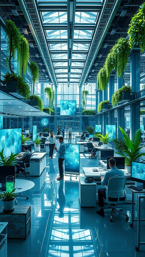 A hyper-realistic depiction of the future of work, showcasing a sleek modern office setting filled with cutting-edge technology and augmented reality interfaces, volumetric lighting casting dynamic shadows over intricate details like translucent digital screens and ergonomic furniture, employees collaborating with AI-driven robots, lush green indoor gardens integrated seamlessly into the workspace, chaos subtly woven into the scene to suggest an organic, dynamic flow, high resolution with a panoramic aspect ratio of 12:24, highlighting the harmonious blend of human and machine in a futuristic yet inviting environment.