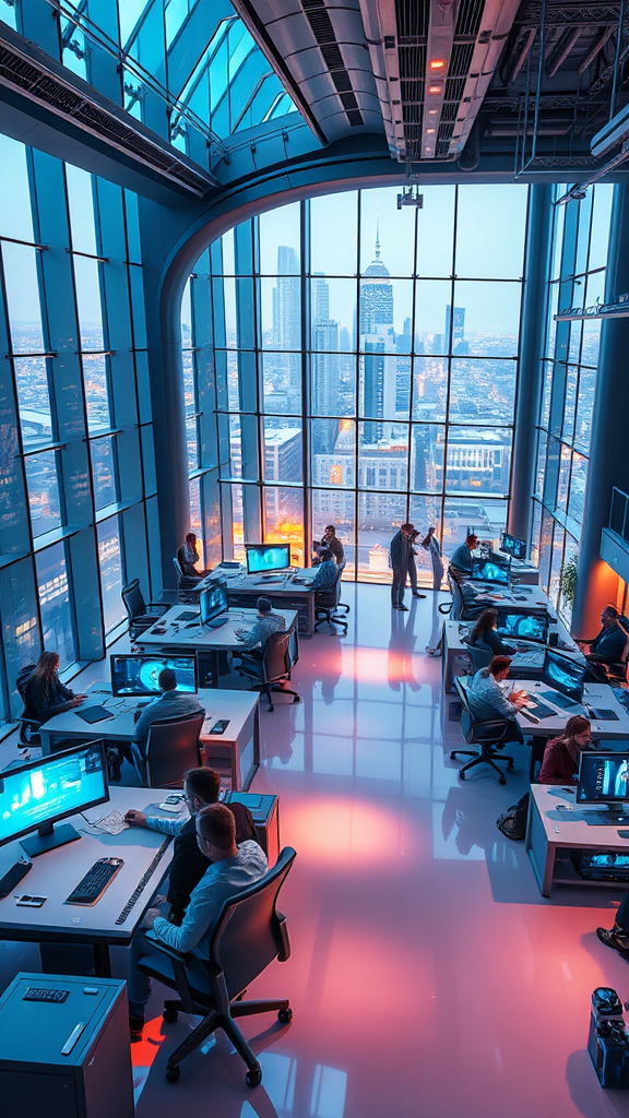 A hyper-realistic depiction of the future of work, showcasing a futuristic office environment with advanced technology and collaborative spaces, illuminated by volumetric lighting that casts dynamic shadows and highlights intricate details in the design, featuring sleek workstations with holographic displays and ergonomic seating, digital interfaces seamlessly integrated into the architecture, employees interacting with augmented reality tools and virtual assistants, the atmosphere buzzing with innovation and creativity, set against a backdrop of a vibrant cityscape visible through large transparent windows, creating a harmonious balance between human and machine interaction in a high-tech, forward-thinking workspace, capturing a sense of order within the potential chaos of rapid technological advancement.