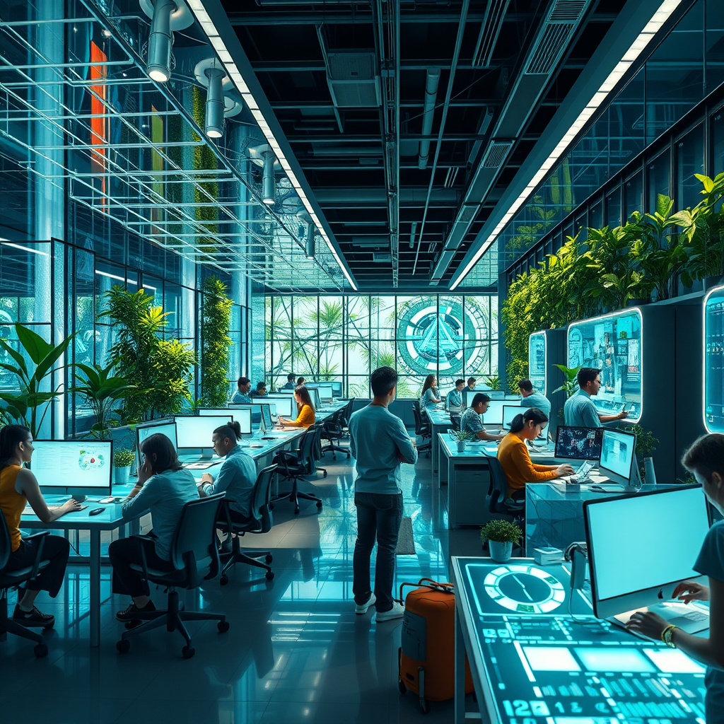 A hyper-realistic depiction of the future of work, showcasing a high-tech office environment with sleek, transparent interfaces and augmented reality displays, volumetric lighting casting intricate patterns across the room, employees collaborating with AI-driven assistants, the ambiance energetic yet focused, featuring a diverse team engaged in dynamic workstations, vertical garden walls adding a touch of nature, elements subtly arranged to create a sense of organized chaos, detailed textures highlighting both the digital and physical aspects, a harmonious blend of innovation and creativity in an elongated aspect ratio.