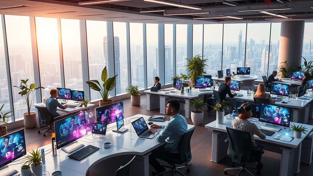 A hyper-realistic depiction of the future of work showcasing an ultramodern office environment with sweeping volumetric lighting illuminating sleek workstations, intricate details of cutting-edge technology seamlessly integrated throughout the space, vibrant holographic displays floating above desks, diverse team members collaborating via advanced virtual reality interfaces, lush indoor greenery enhancing the atmosphere, a backdrop of sprawling cityscapes visible through expansive windows, the scene infused with dynamic energy and innovative chaos, capturing a vision of productivity and progress with a vertical orientation.