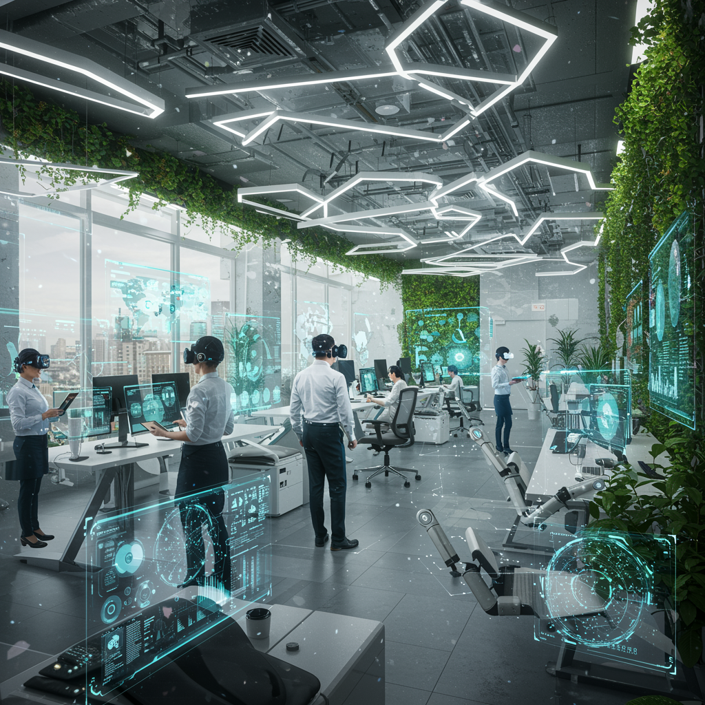 A hyper-realistic depiction of the future of work showcasing a sleek, technologically advanced workspace filled with augmented reality interfaces and holographic displays, bathed in soft volumetric lighting that casts intricate patterns across the room. The environment features a blend of nature and technology, with green walls and futuristic eco-friendly furniture, highlighting sustainability. Workers collaborate seamlessly with AI-driven robotic assistants, while digital screens display real-time data analytics. The scene is bustling with dynamic energy, reflecting a chaotic yet harmonious workflow, set against a tall, narrow vertical frame.