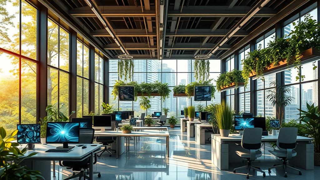 A hyper-realistic depiction of the future workspace showcasing seamless integration of advanced technology and nature; a spacious open-plan office with large glass walls revealing verdant outdoor scenery, futuristic workstations with holographic displays, robotic assistants, and ergonomic furniture. Gentle volumetric lighting casts a warm glow through the space, highlighting the intricate details of energy-efficient devices, vertical garden installations, and smart, interactive surfaces. The atmosphere is one of chaos and harmony, where digital innovation meets organic tranquility in a balanced, eco-friendly environment. The scene conveys an elongated perspective of 12:24 ratio, inviting viewers into a world where work and wellness coexist seamlessly.