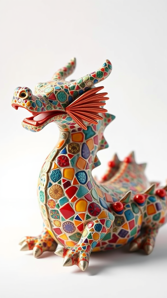 A hyper-realistic digital art piece of an aroma diffuser, inspired by Antoni Gaudi's whimsical Park Guell in Barcelona, featuring a vibrant ceramic exterior shaped like a mosaic dragon. The dragon is adorned with intricate, colorful tile patterns, capturing the enchanting and playful essence of Gaudi's designs. The texture of the tiles appears almost tangible, with exquisite detailing that showcases a masterful blend of art and functionality. Set against a crisp white background, the dragon diffuser exhibits a stunning depth of field, bringing the artwork to life as if rendered in unreal engine, presented in an 8K resolution. The atmosphere conveys a sense of liveliness and fantasy, reminiscent of a Gaudian wonderland.
