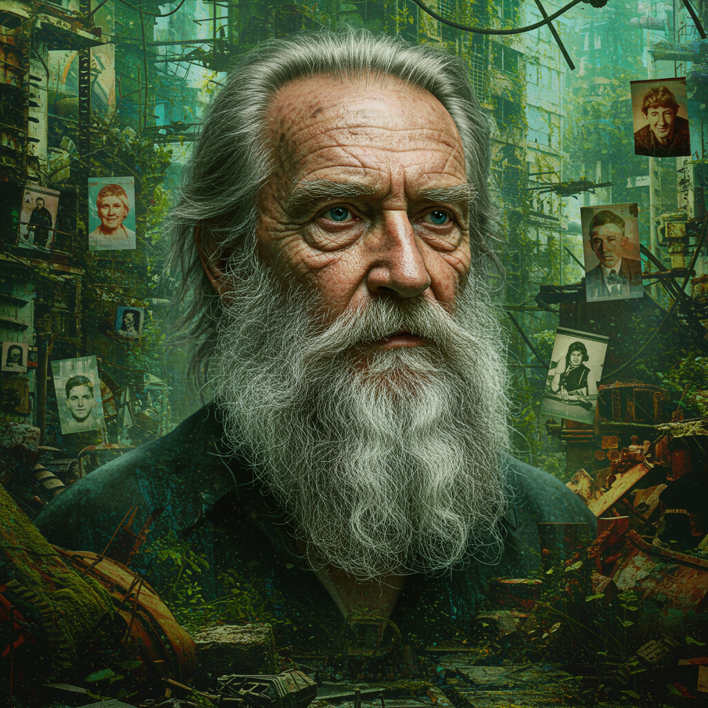 A hyper-realistic digital painting of an elderly man with a long, grizzled beard, interwoven with streaks of dark gray, set against an urban backdrop brimming with intricate detail. The scene captures the essence of algeapunk, with vibrant greens and teals from moss and vegetation enveloping the rusty debris of a forgotten city. His wise, piercing eyes gaze into the distance, contrasting with the soft-focus of surrounding portraits that echo life and history in vibrant colors. The urban environment pulses with an almost organic rhythm, reminiscent of flickr's raw, candid moments, while subtle creative touches bring an ethereal quality to the man's worn expression, hinting at countless stories untold.
