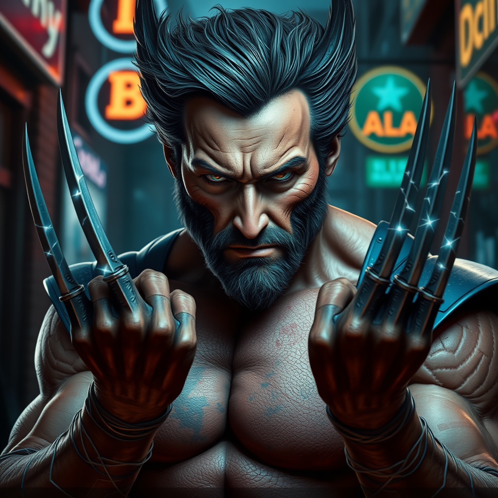 A hyper-realistic digital portrait of Logan, known as Wolverine, crafted with a unique blend of photo-realism and fantastical textures. Wolverine's rugged, weathered face and sinewy physique are depicted in meticulous detail, with minor scars and bruises adding to the gritty authenticity. His adamantium claws are extended in a dynamic pose, their sharp steel catching the glow of neon signs in a shadowy alley. Luminous threads subtly weave through his muscles and between armor plates, resembling intricate circuitry, giving a futuristic edge to his timeless, indomitable presence.