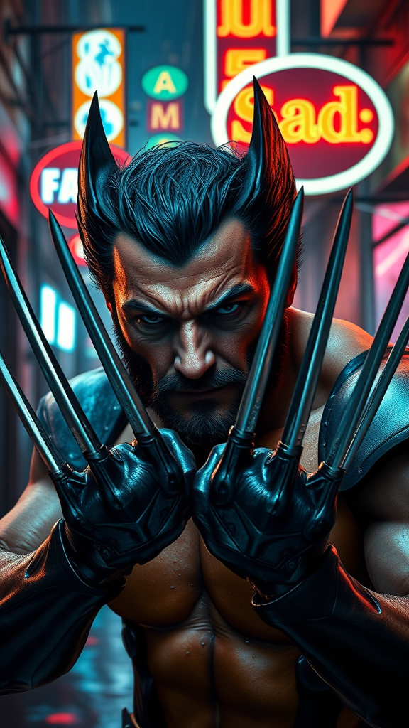 A hyper-realistic digital portrait of Wolverine, expertly blending photorealism with imaginative textures. His rugged, grizzled face and powerful physique are meticulously rendered, showcasing every minor scar and bruise for added authenticity. Wolverine's adamantium claws are fully extended, reflecting the cold gleam of razor-sharp steel beneath the flickering glow of neon signs in a gritty urban alleyway. Subtle luminescent veins pulse through his muscles and between segments of his armor, resembling a network of futuristic circuitry. The setting is atmospheric, with rain slicking the alley's surfaces and casting reflections of the vibrant neon hues, enhancing the dynamic tension of Wolverine's combative pose.
