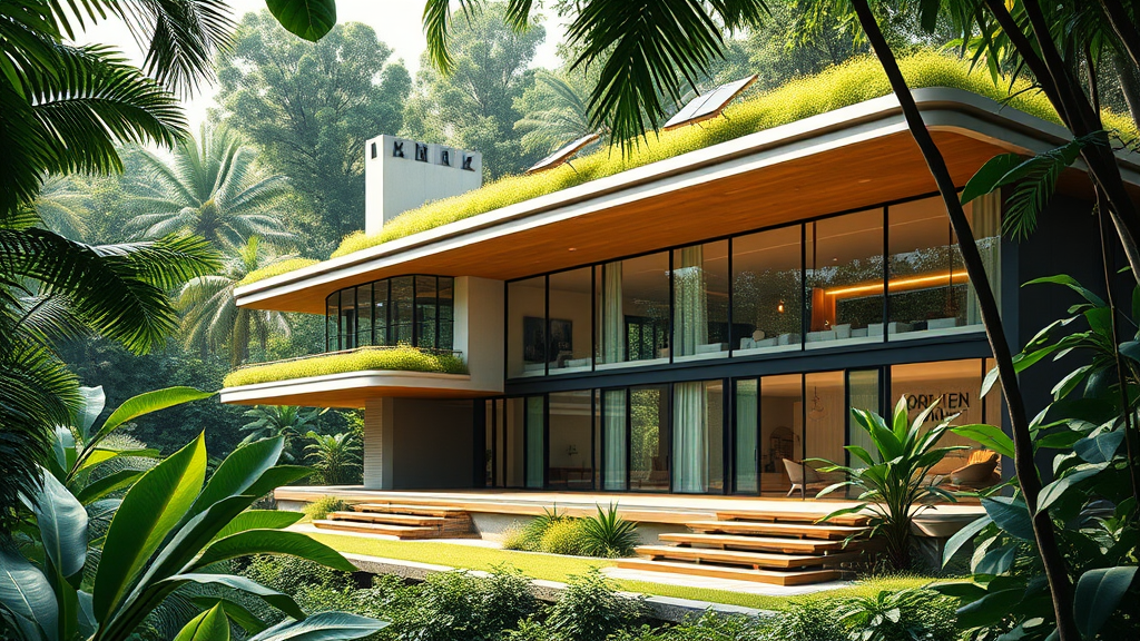 A hyper-realistic exterior photo captures a futuristic-style house nestled in the lush jungle, viewed from eye level. The scene is bathed in natural daylight with soft, indirect lighting that highlights the structure's sleek lines and innovative design. The architectural design draws inspiration from iconic figures like Frank Lloyd Wright, Charles and Ray Eames, and Mies van der Rohe, featuring expansive glass walls, cantilevered sections, and an organic integration with the surrounding environment. Unique artistic elements include a living green roof and solar panels blending seamlessly into the architecture, all set amidst the vibrant greenery of the jungle backdrop, as if lifted from the pages of AD magazine.