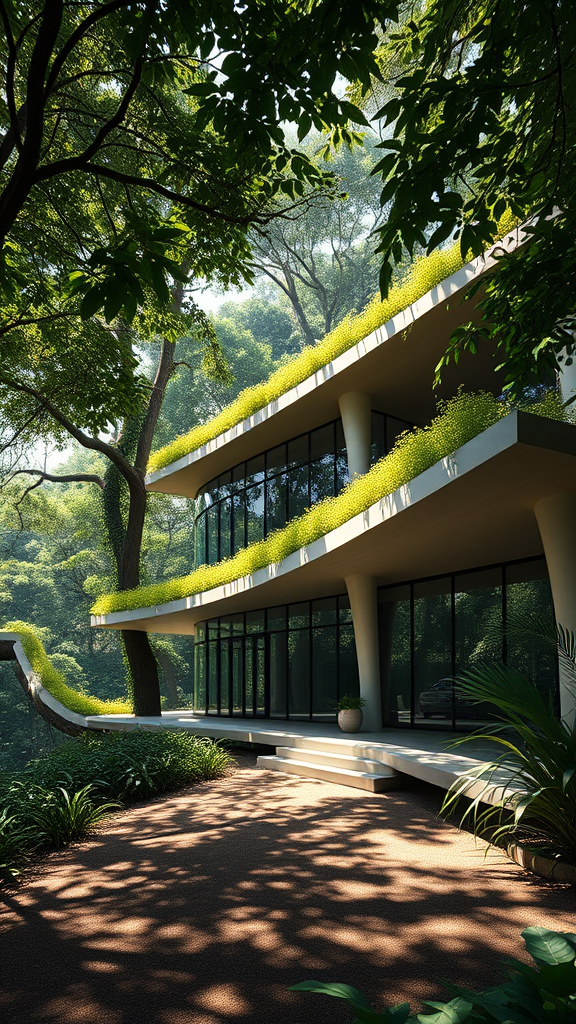 A hyper-realistic exterior photo captures a futuristic-style house seamlessly integrated with its jungle surroundings, viewed at eye level. Sunlight filters through the dense canopy, casting gentle, indirect lighting on sleek glass walls and organic architectural forms. The design draws inspiration from the visionary works of Frank Lloyd Wright, with elements of Eames’ innovative style and Mies van der Rohe’s minimalist elegance. The house features expansive open spaces, blending nature and structure, with a living roof lush with greenery, and cantilevered terraces that offer breathtaking views of the verdant landscape. Dappled shadows dance on the ground, enhancing the serene ambiance, as the structure harmonizes effortlessly with the vibrant ecosystem.