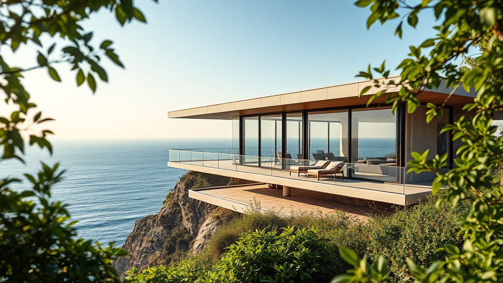 A hyper-realistic exterior photo of a mid-century modern style house, featuring expansive glass walls and clean lines, nestled on a cliff with a panoramic ocean view, bathed in soft, diffused daylight. The design subtly echoes the innovative flair of Frank Lloyd Wright, the sleek elegance of the Eames, and the minimalist precision of Mies van der Rohe. Lush greenery frames the scene, with a cantilevered terrace stretching towards the horizon, creating a seamless indoor-outdoor flow that epitomizes luxurious coastal living.