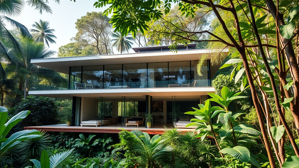 A hyper realistic eye level exterior photo of a cutting-edge architectural masterpiece, with influences from Frank Lloyd Wright, Charles and Ray Eames, and Mies van der Rohe, featuring a sleek, glass-walled house seamlessly integrated into a verdant jungle setting. Taken in broad daylight with soft, indirect lighting, the structure showcases a harmonious blend of natural elements and modern design, with large cantilevered terraces and open-plan spaces that invite the lush greenery indoors. The house is adorned with minimalist furnishings and sustainable materials, reflecting a refined and sophisticated aesthetic worthy of an AD magazine cover.