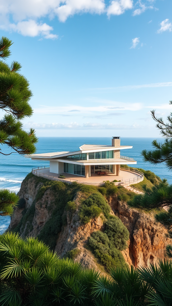 A hyper-realistic eye level exterior photo of a mid-century modern style house perched on a cliff with sweeping ocean views, captured during daylight with soft, indirect lighting. The architecture blends influences of Frank Lloyd Wright, Eames, and Mies van der Rohe, featuring clean lines, expansive glass windows, and natural materials. The scene is set against a backdrop of azure skies and gently rolling waves, with lush greenery framing the property for a touch of organic contrast.