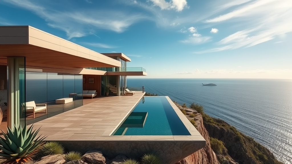 A hyper-realistic eye-level exterior photo of a mid-century modern style house with expansive glass walls and clean geometric lines perched on a cliff overlooking a majestic ocean view, captured in natural daylight with soft indirect lighting. The scene evokes the architectural genius of Frank Lloyd Wright, Charles and Ray Eames, and Mies van der Rohe, with cantilevered spaces and a seamless blend of indoor and outdoor living. The facade features a mix of natural stone and warm wood elements, while a minimalist infinity pool mirrors the serene ocean horizon. The setting is enhanced by a carefully curated landscape of native plants and a gentle ocean breeze, exuding a sense of tranquility and timeless modernity perfect for the pages of AD magazine.