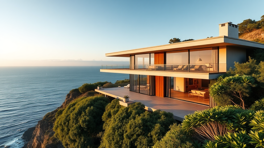 A hyper realistic eye level exterior photo of a mid-century modern style house perched on a cliff with panoramic ocean views, illuminated in soft daylight with indirect lighting. The design features clean lines and expansive glass windows, evoking influences from iconic architects like Frank Lloyd Wright, Charles and Ray Eames, and Mies van der Rohe. Lush greenery surrounds the minimalist structure, with a cozy patio area that seamlessly blends indoor and outdoor living, capturing the essence of sophisticated coastal living as featured in a luxury architecture magazine.