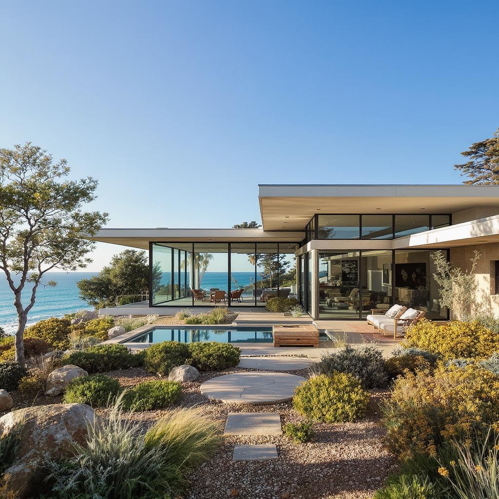 A hyper realistic eye level exterior photo of a mid-century modern house with sweeping views of the ocean, bathed in natural daylight with soft indirect lighting; the design elegantly blends the clean lines and open spaces reminiscent of Frank Lloyd Wright, the functional charm of Eames, and the minimalist elegance of Mies van der Rohe, featuring large floor-to-ceiling glass windows, a cantilevered roof, and a beautifully landscaped garden with native coastal plants.