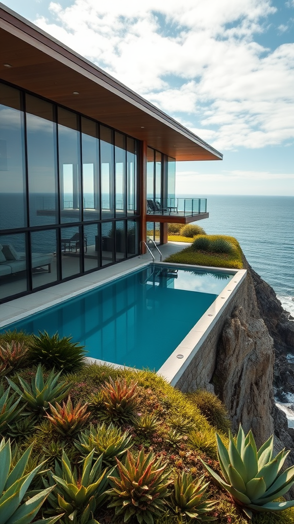 A hyper-realistic eye-level exterior photograph of a mid-century modern house perched on a cliff with panoramic ocean views, bathed in soft daylight and featuring indirect lighting. The house exhibits architectural influences from Frank Lloyd Wright, Charles and Ray Eames, and Mies van der Rohe, with expansive glass walls, clean lines, and a seamless integration with the surrounding landscape. The setting includes a meticulously landscaped garden filled with native coastal plants, and a sleek infinity pool mirrors the color of the ocean, adding a touch of serenity and luxury.