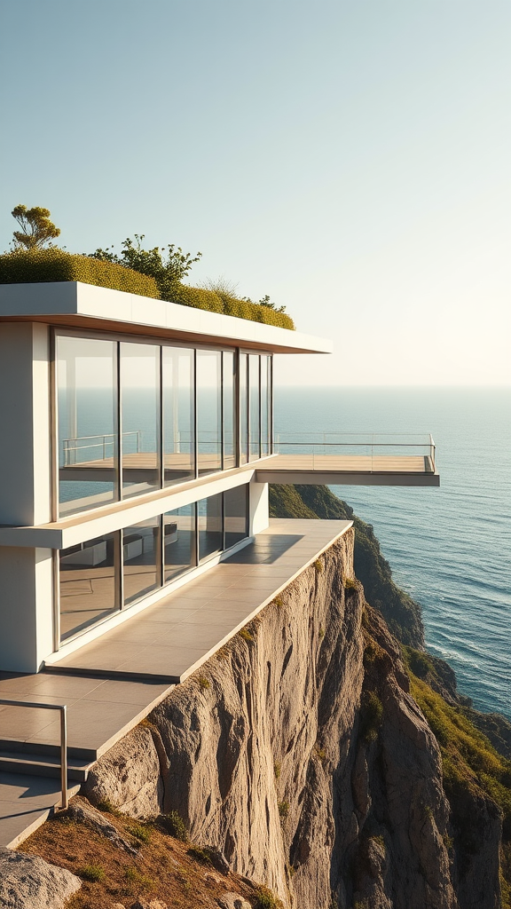 A hyper-realistic eye-level exterior view of a mid-century modern style house with clean lines and minimalist design, perched on a cliff with sweeping ocean views in the background. The scene is illuminated by soft daylight, creating an atmosphere of understated elegance. Large glass panels reflect the tranquil sea, seamlessly merging indoor and outdoor spaces. The architecture echoes the genius of Frank Lloyd Wright, Eames, and Mies van der Rohe, with subtle creative touches like a lush rooftop garden and a cantilevered deck for dramatic effect, epitomizing the sophistication of an Architectural Digest feature.