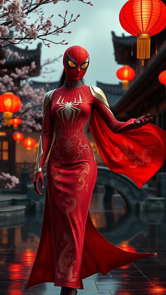 A hyper-realistic female Spider-Woman stands confidently in a photorealistic 8K rendering, showcasing her full-body costume inspired by a traditional Chinese qipao. Her suit features a deep crimson base adorned with exquisite gold embroidery of dragons and phoenixes, seamlessly incorporating subtle spider-web patterns. The high-collared neckline and side slits mirror the elegance of a qipao, while modern superhero elements like armored sleeves and gloves add a futuristic touch. Her mask, matching the deep red of her costume, features luminous golden eyes that convey a powerful, enigmatic presence. A flowing silk cape, decorated with delicate gold lotus flower patterns, trails behind her, adding an element of grace and motion. Set in the heart of a traditional Chinese courtyard at dusk, ancient red lanterns emit a gentle glow amidst the pagoda-style architecture. Cherry blossom trees and a stone bridge over a serene pond enhance the tranquil yet majestic ambiance. The ground mirrors the lantern light post-rain, with swirling mist adding a layer of mystique. Her pose is dynamic yet graceful, exuding strength and poise. The scene comes to life with hyper-detailed textures, lifelike proportions, and cinematic lighting, capturing the elegance and allure of Chinese culture. Shot in natural light with a Sony A7III camera, UHD quality.