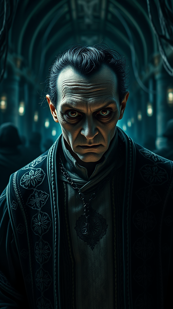 A hyper-realistic figure emerges from the dark kingdom, his large eyes expressing deep horror. His clothing, intricately designed, carries orthodox symbolism with exquisite detail. Captured on a Hasselblad H4D 200MS Digital Camera using a Mitakon Speedmaster 65mm f/1.4 XCD lens, the scene is illuminated by precise Fresnel lighting, emphasizing the textures and shadows of the setting. The chilling atmosphere is enhanced by an elongated composition and a sense of otherworldly ambience.