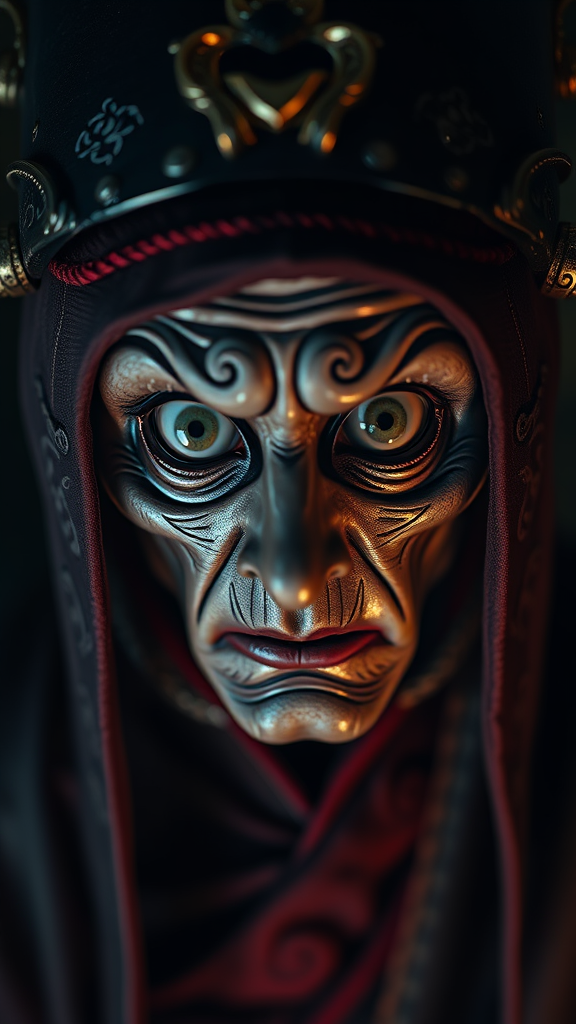 A hyper-realistic figure emerges from the shadows of the dark kingdom, their intricately orthodox symbolic attire tells tales of ancient traditions. The large, expressive eyes, wide with horror, captivate attention with their unsettling intensity. Captured with the unmatched clarity of a Hasselblad H4D-200MS Digital Camera paired with a Mitakon Speedmaster 65mm f/1.4 XCD lens, the image is bathed in the dramatic focus of Fresnel lighting, enhancing every detail and creating a haunting, otherworldly aura.